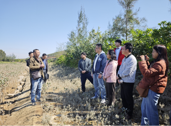 随后,大家走进孔雀湾红树林核心修复区,实地察看了桐花树、秋茄等本地红树林品种的生长修复情况。红树林修复专家、资源与环境学院王日明教授现场讲解红树林“保育结合、育栽一体”修复技术,系统介绍了红树林在防风消浪、固碳储碳、净化海水等方面的重要生态价值,以及该区域从生态受损到逐步恢复的治理历程。通过实地观摩,党员们切身认识到生态修复的显著成效,对“人与自然和谐共生”的发展理念有了更直观、更深刻的理解。